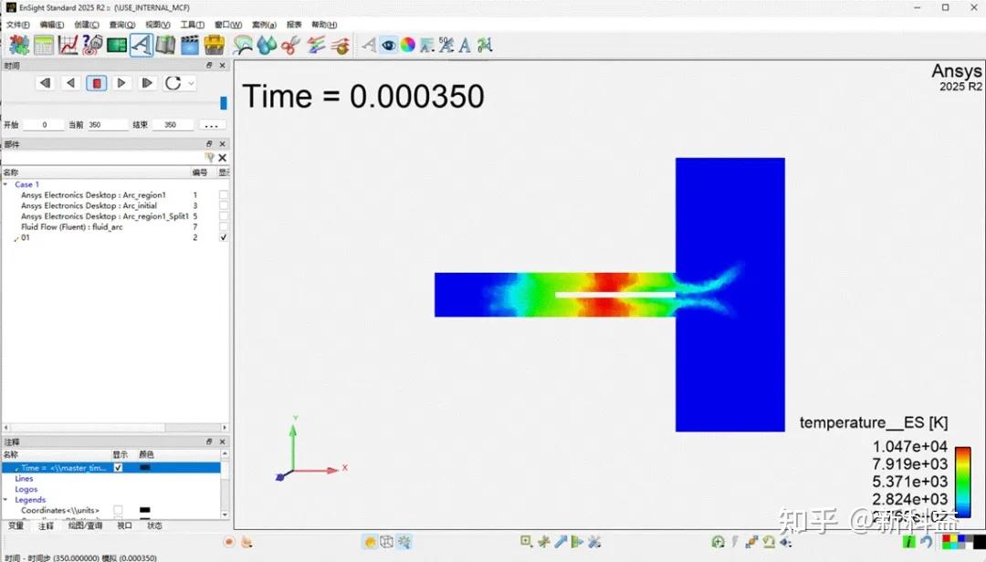电弧在洛伦兹力驱动下从导轨底部向上运动,Fluent 输出的温度场云图显示:电弧中心温度最高达10000K,且随运动过程逐渐扩散;后处理自动导出至 Ensight,可清晰观察电弧传播轨迹。该案例验证了方案对电弧宏观运动的模拟能力,仿真耗时较传统分步计算缩短 30%,数据传递无人工干预误差。