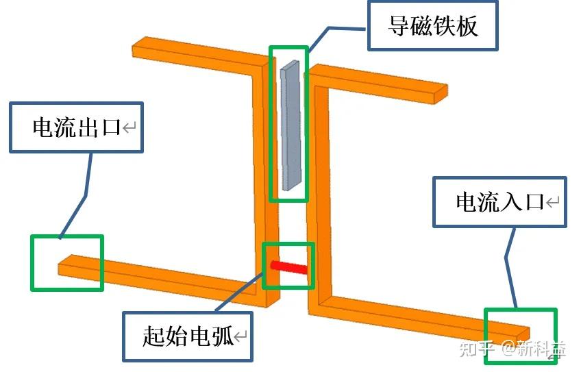 几何:两根平行导轨(铜材质),电流从一端流入、另一端流出,电弧初始位于导轨底部;
