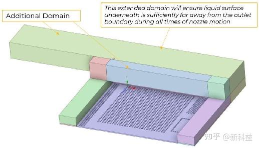 几何模型准备:首先,在底部填充过程中,喷嘴从一端移动到另一端。为确保液面不靠近压力出口边界,建议创建如下所示的几个附加域,带有喷嘴的附加区域在给定的逻辑控制下进行横向移动,接触面interface类型。