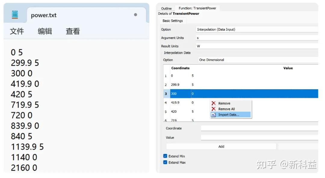 1. 定义一个用户自定义函数用于完整周期计算,命名为瞬态功率(TransientPower)。该函数可通过两种方式创建:在函数界面右键菜单中选择"导入数据"选项导入包含时间/功率(单位:瓦特)数据的.txt文件,或直接在函数窗口中输入数据点(如下图所示)。