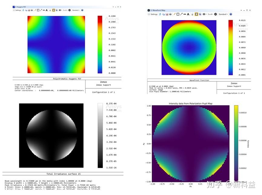 应用数据后,在 OpticStudio 中进行综合分析,包括波前图分析、惠更斯 PSF 计算、偏振瞳孔图数据和物理光学传播 (POP) 仿真以验证结果。这些分析可以交叉引用以验证一致性和准确性,并通过测试板后测试结果的详细可视化来展示应力引起的双折射如何影响光学性能。如下为光学分析结果: