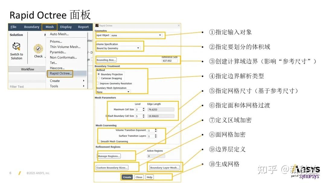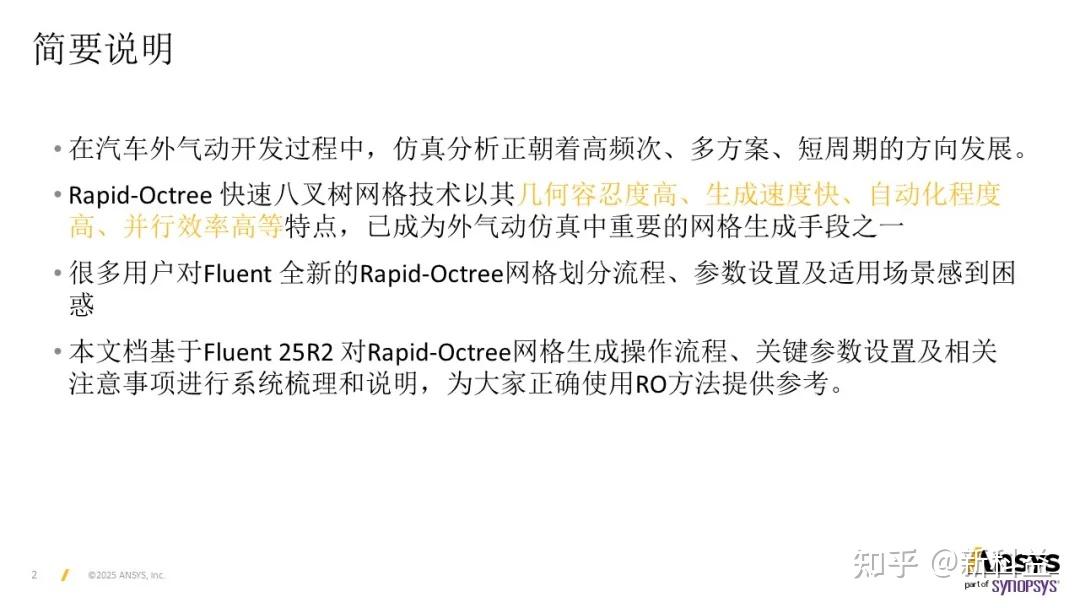 ‐ 鉴于很多用户对Fluent 全新的Rapid-Octree网格划分流程、参数设置及适用场景感到困惑,本文档基于Fluent25R2版本对Rapid-Octree网格生成操作流程、关键参数设置及相关注意事项进行系统梳理和说明,为大家正确使用RO方法提供参考。