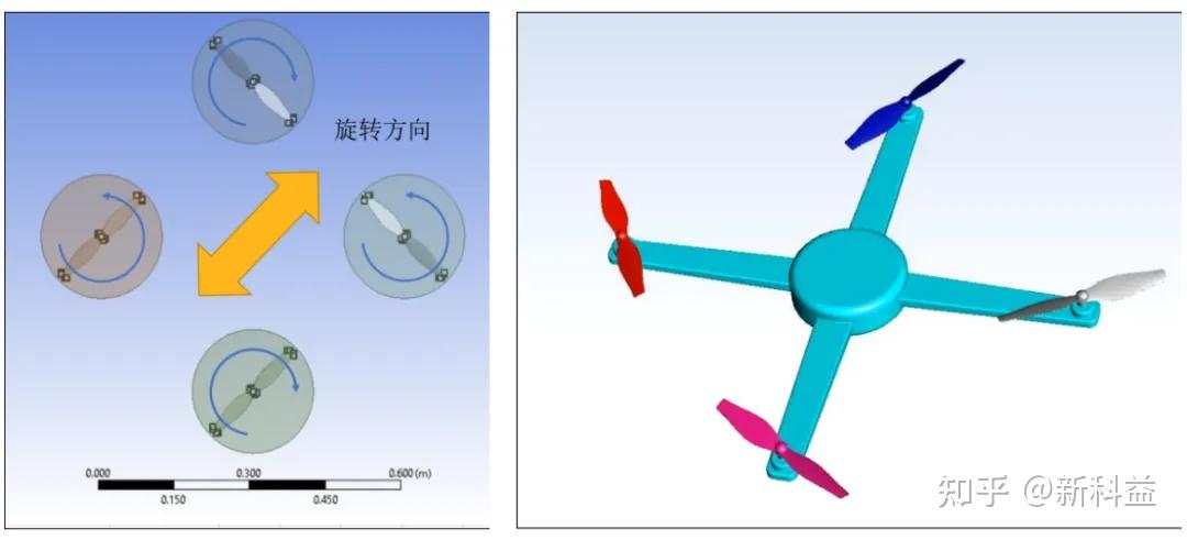 1、简化模型以及初始工况:模型为具有四个螺旋桨的简单四轴飞行器几何结构。机翼采用反向旋转的螺旋桨,这是无人机设计的典型特征。