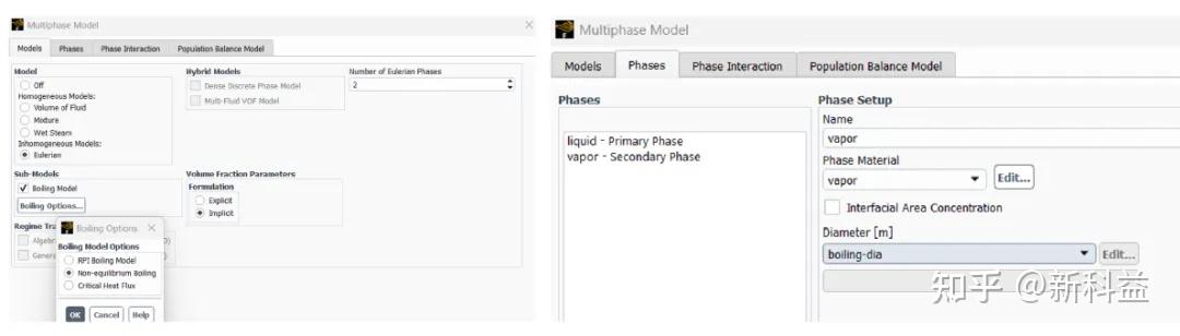 服务器浸没式液冷或换热器等直接浸没式冷却系统的热性能预测,浸没式冷却中,冷却液温度低于饱和温度,电子元件发热表面易产生过冷沸腾,且汽液传热传质复杂,用非平衡模型可更准捕捉气泡生成、脱离及蒸汽升温过程,帮助优化冷却液流道设计;主相为液体,副相为蒸汽,副相的直径设置采用boiling-dia模型,该模型其核心特点是专门针对沸腾过程中蒸汽泡的动态直径变化进行建模,根据壁面过热度、热流密度、液体物理性质(如表面张力、粘度)等沸腾核心参数,通过经验关联式实时计算气泡直径,更贴合实际沸腾物理过程。