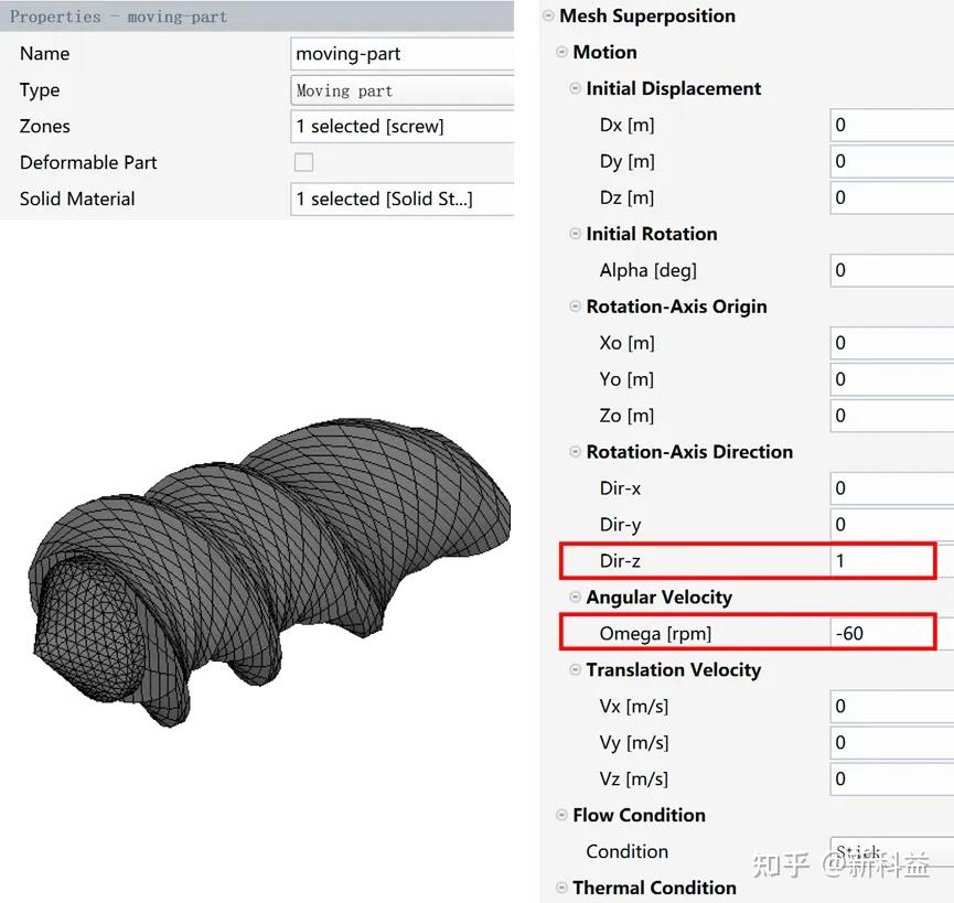 螺杆旋转运动的定义:z轴转轴方向,转速为60RPM,正负值采用右手定则
